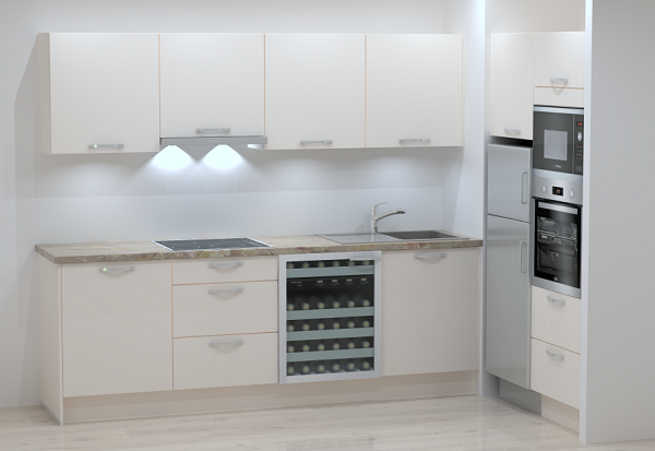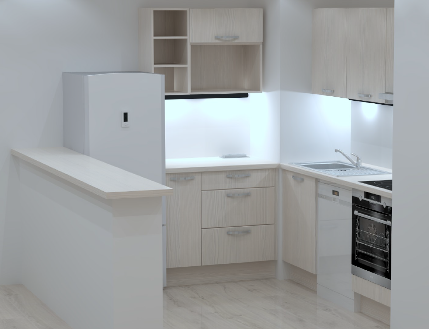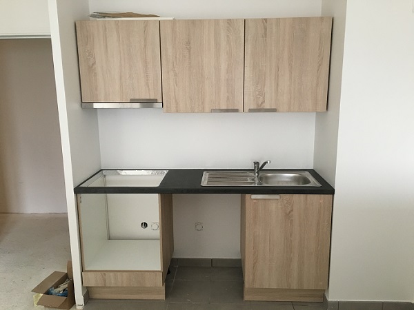 Notre partenaire Les Sitelles pense l’offre de cuisines semi-équipées dès la conception de ses logements. C’est pourquoi nous retrouvons le même linéaire de 180cm dans tous les appartements. Ces linéaires se composent des éléments suivants : meuble bas sous-évier, niche pour lave-vaisselle, meuble bas pour four, plan de travail stratifié intégrant une plaque de cuisson 2 ou 4 feux (selon la typologie de l’appartement) et un évier inox avec son mitigeur, un meuble haut sur hotte télescopique et un meuble haut de rangement de 120cm.