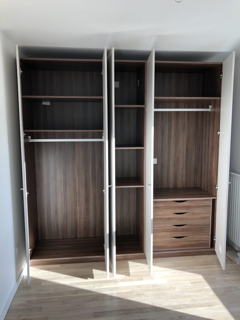 Pour compléter l’aménagement de ce logement, il ne restait plus qu’à équiper la chambre d’un grand placard, permettant ainsi aux occupants d’emménager sans contraintes de temps ou de rangements. Ainsi, grâce à l’un de nos fournisseurs, il a été possible de composer un rangement entièrement sur-mesure, aux coloris choisis et avec l’aménagement intérieur parfaitement adapté.
