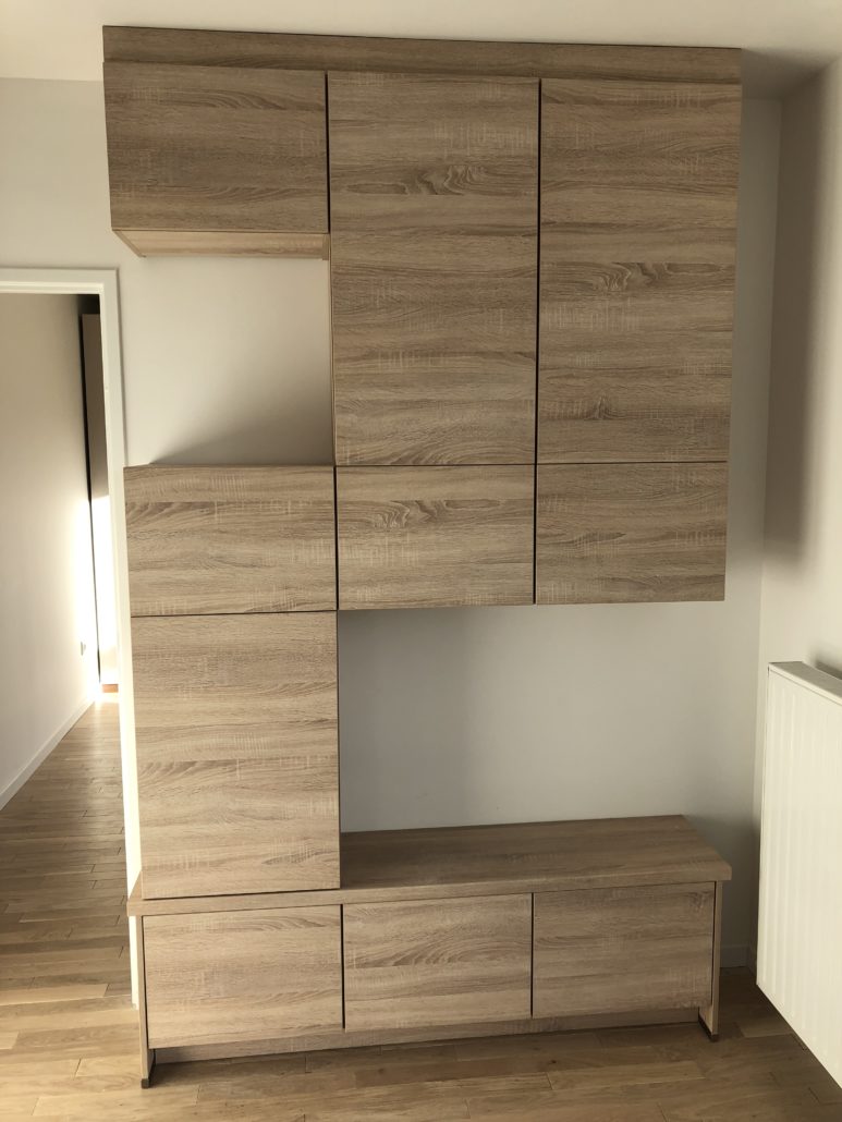 L’acquéreur avait une idée bien arrêtée de l’espace télévision souhaité, croquis à l’appui ! Il nous a donc fallu reproduire ce souhait avec notre nomenclature et le résultat est là : un espace télévision intégrant un maximum de rangements et quelques niches permettant d’y ajouter une touche de décoration.