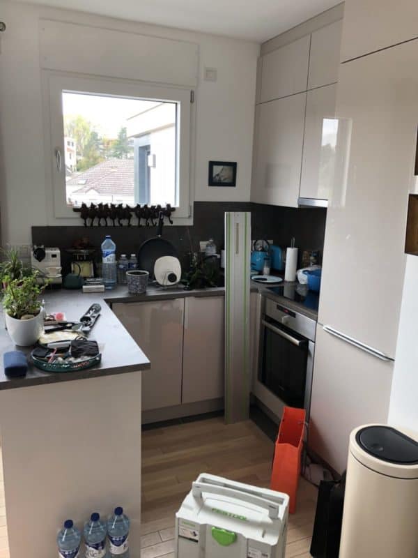 L’espace cuisine contraignant n’a pas facilité l’intégration de tous les éléments au mieux et notre process a été éprouvé pour que tout soit livré au bon moment, sans souffrir de retard ni gêner la pose dans 3 espaces différents de ce 2 pièces au 4ème étage.