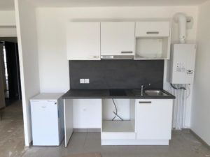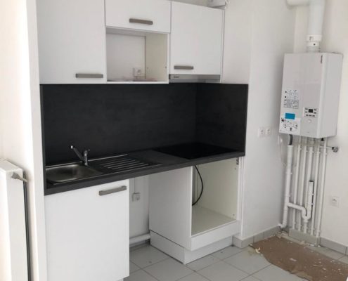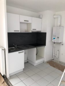 Nous avons donc posé 4 cuisines selon des implantations type et semi-équipées : plaques de cuisson 2 ou 4 feux et hottes CANDY, éviers inox et mitigeurs BLANCO, niches pour le lave-vaisselle et le réfrigérateur.